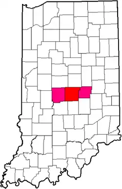 The Central Suburban Conference in Indiana. Counties in red contained schools at the time of disbanding, counties in pink contained former member schools who left before conference folded.