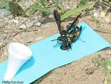 When hunting for buprestid prey, the maximum foraging range of the wasp is estimated at 2 km with an estimated average flight distance of 750 meters from the nest. Once prey has been found, a female wasp will typically attack a target beetle by alighting on it, climbing over it, and grabbing it by the thorax with her mandibles before inserting her stinger into the base of the beetle's leg (in the membrane of the coxal joint, a gap in the buprestid's armour) and injecting a paralytic venom. Once at the nest entrance or in the burrow, the female wasp will sometimes re-sting poorly paralyzed prey in the same joint.