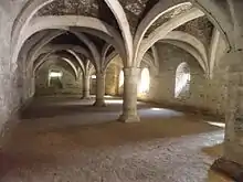Two elements date from the first period of Germolles (13th century). They are still conserved because they were integrated into the project of transformation in a ducal palace. The large wine cellar used for the storage of wine and food has conserved its medieval appearance with modern gothic next to traditional Burgundian romanesque elements. The lower chapel has similar architecture but has sculptured decoration with both romanesque reliefs and gothic foliage.