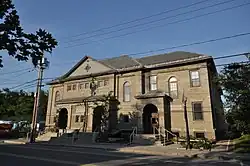 The Chandler Music Hall is located in downtown Randolph, on the east side of Main Street just northeast of its junction with School Street. It is a large two-story masonry structure, built out of rusticated cast concrete blocks and covered by a truncated hip roof. Its styling is basically Romanesque, with arched entrances (two to the theater, one to the former parish house) and a combination of round-arch and rectangular windows. The theater entrances are set in a hip-roofed projecting that fronts a gable-roofed projection on the northern side of the main facade.[2]