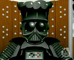 Mimicking a scene from the finale of Star Wars: Episode III – Revenge of the Sith, Chef's body is secretly collected by the Super Adventure Club, who managed to revive him as a cyborg — identified on the show's official website as "Darth Chef" (a parody of Star Wars' Darth Vader). He is fitted with a suit and mask like those of Vader, except with the helmet taking on the appearance of Chef's trademark hat, and wields a red, glowing spatula, parodying Vader's red lightsaber. Darth Chef's voice was provided by British comedian and filmmaker Peter Serafinowicz, who voiced Darth Maul in Star Wars: Episode I – The Phantom Menace. Darth Chef has not made an appearance in subsequent episodes, but has appeared with other characters in the background of the South Park opening sequence, and is mentioned in the episode "Stunning and Brave", when PC Principal says the kids drove him to kill himself, which is not true.[20]