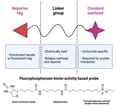 Activity-based protein profiling (ABPP, also activity-based proteomics) is a technique that was developed to monitor the availability of enzymatic active sites to their endogenous ligands.[4] ABPP uses specially designed probes that enter and form a covalent bond with an enzyme's active site, which confirms that the enzyme is an active state.[6] The probe is typically an analog of the drug whose mechanism is being studied, so covalent labeling of an enzyme is indicative of drug binding. ABPP probes are designed with three key functional units: (1) a site-directed covalent warhead (reactive group); (2) a reporter tag, such as biotin or rhodamine; and (3) a linker group.[7] The site-directed covalent warhead, also called a covalent modifier, is an electrophile that covalently modifies a serine, cysteine, or lysine residue in the enzyme's active site and prevents future interactions with other ligands.[6] ABPP probes are generally designed against enzymatic classes, and thus can provide systems-level information about the impact of cell state on enzymatic networks. The reporter tag is used to confirm labeling of the enzyme with the reactive group and can vary depending on the downstream readout. The most widely used reporters are fluorescent moieties that enable imaging and affinity tags, such as biotin, that allow for pull-down of labeled enzymes and analysis via mass spectrometry. There are drawbacks to each strategy, namely that fluorescent reporters do not allow for enrichment for proteomic analysis, while biotin-based affinity tags co-purify with endogenously biotinylated proteins.[7] A linker group is used to connect the reactive group to the reporter, ideally in a manner that does not alter the activity of probe. The most common linker groups are long alkyl chains, derivatized PEGs, and modified polypeptides.[4]