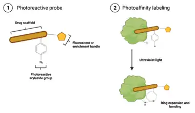 Unlike ABPP, which results in protein labeling upon probe binding, photoaffinity labeling probes require activation by photolysis before covalent bonding to a protein occurs.[6] The presence of a photoreactive group makes this possible.[6] These probes are composed of three connected moieties: (1) a drug scaffold; (2) a photoreactive group, such as an phenylazide, phenyldiazirine, or benzophenone; and (3) an identification tag, such as biotin, a fluorescent dye, or a click chemistry handle.[8] The drug scaffold is typically an analog of a drug whose mechanism is being studied, and, importantly, binds to the target reversibly, which better mimics the interaction between most drugs and their targets.[8] There are several varieties of photoreactive groups, but they are fundamentally different from ABPP probes: while ABPP specifically labels nucleophilic amino acids in a target's active site, photoaffinity labeling is non-specific, and thus is applicable to labeling a wider range of targets.[6] The identification tag will vary depending on the type of analysis being done: biotin and click chemistry handles are suitable for enrichment of labeled proteins prior to mass spectrometry based identification, while fluorescent dyes are used when using a gel-based imaging method, such as SDS-PAGE, to validate interaction with a target.[6][8]