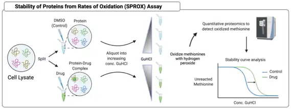 Stability of Proteins from Rates of Oxidation also rests upon the assumption that ligand binding confers protection to proteins from manners of degradation, this time from oxidation of methionine residues. In SPROX, a lysate is split and treated with drug or a DMSO control, then each group is further aliquoted into separate samples with increasing concentrations of the chaotrope and denaturant guanidinium hydrochloride (GuHCl). Depending on the concentration of GuHCl, proteins will unfold to varying degrees. Each sample is then reacted with hydrogen peroxide, which oxidizes methionine residues. Proteins that are stabilized by the drug will remain folded at higher concentrations of GuHCl and will experience less methionine oxidation. Oxidized methionine residues can be quantified via LC-MS/MS and used to generate methionine stability curves, which are a proxy for drug binding. There are drawbacks to the SPROX assay, namely that the only relevant peptides from SPROX samples are those with methionine residues, which account for approximately one-third of peptides, and for which there are currently no viable enrichment techniques. Only those methionines that are exposed to oxidation provide meaningful information, and not all differences in methionine oxidation are consistent with protein stabilization. Without enrichment, LC-MS/MS analysis of these peptides is challenging, as the contribution of other sample components to mass spectrometer noise can drown out relevant signal. Therefore, SPROX samples require fractionation to concentrate peptides of interest prior to LC-MS/MS analysis.[15]
