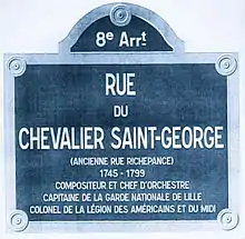 In 1753, his father took Joseph, aged seven, to France for his education, installed him in a boarding school, and returned to Guadeloupe.[17] Two years later, on 26 August 1755, listed as passengers on the ship L'Aimable Rose, Bologne de Saint-Georges and Nanon landed in Bordeaux.[18] In Paris, reunited with their son Joseph, they moved into a spacious apartment in the 6th Arrondissement at 49 rue Saint André des Arts.[19][20]