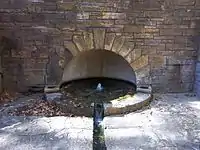 Travertine district, embracing the old Platt National Park, is like a large city park, three miles long and less than one mile wide. A narrow road circles the district, passing by parking areas, camp and picnic grounds, the Travertine Nature Center, swimming holes, and springs. A bison pasture was constructed by the Civilian Conservation Corps in the 1930s.[12][13] Travertine Creek, joined by Rock Creek, flows through the district, rising in Antelope Springs and Buffalo Springs at the eastern end of the park. The springs produce 5 million gallons per day (20 million liters) of cool, crystal clear-water and form Travertine Creek which is joined by Rock Creek about 2 miles from its source. A number of other fresh water and mineral springs contribute to Travertine and Rock Creek as they flow through Travertine District, dropping in small waterfalls over several ledges. Several miles of walking and biking trails wind through the heavily forested creek bottomland. Very popular and often crowded in summer, the Travertine district has been described as an oasis in the Oklahoma prairie.[14]