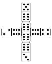 Chickenfoot or Chicken Foot, also called Chicken-Foot Dominoes and Chickie Dominoes,[lower-alpha 1] is a Block domino game of the "Trains" family for 2 to 12 players invented by Louis and Betty Howsley in 1986.[1] Chicken Foot is played in rounds, one round for each double domino in the set and is best for 4 to 7 players.[2]