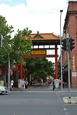 Chinatown in Adelaide, South Australia, Australia, also called Adelaide Chinatown (Chinese: 阿德雷得唐人街) or Moonta Street Chinatown, is located on Moonta Street, within the large Adelaide Central Markets precinct between Grote and Gouger streets in the Adelaide city centre. Two large Paifang, which were erected by the city council, are guarded by the Chinese guardian lions.[1] They mark the entrances at either end. Adelaide Chinatown consists mainly of Chinese restaurants, grocery stores and markets but also consists of many non-Chinese Asian restaurants offering cuisines of Indian, Japanese, Korean, Malaysian, Nepali, Thai and Vietnamese origins.[2][3]