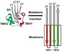 Six short α-helices in D3 unfold to form two transmembrane β-hairpin (TMH), TMH1 (red) and TMH2 (green).[8]