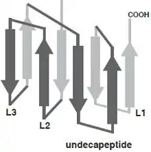 At the level of the primary structure, cholesterol dependent cytolysins (CDCs) display a high degree of sequence similarity ranging from 40% to 80%. This is mainly reflected in the conserved core of about 471 amino acids shared by all CDCs, which essentially corresponds to the sequence of pneumolysin, the shortest member of the family.[4] CDCs with longer sequences usually display variations in the N-terminus, the functions of which are unknown for many members but for some are believed to serve various functions unrelated to secretion. For instance, listeriolysin O (LLO; TC# 1.C.12.1.7) from Listeria monocytogenes exhibits a proline rich sequence at its amino terminus that plays a role in the stability of LLO.[5] The extreme case is lectinolysin (LLY; UniProt: B3UZR3) from some strains of Streptococcus mitis and S. pseudopneumoniae contain a functional fucose-binding lectin at the amino terminus.[6][7] Furthermore, all CDCs contain a highly conserved undecapeptide, which is thought to be critical for cholesterol-mediated membrane recognition. The CDC monomer consist of 4 structural domains, with domain 4 (D4) being involved with membrane binding.[8] Multiple CDC monomers will oligomerize once bound to the target cell membrane forming a β-barrel structure which will be inserted into the target cell membrane. The core section of amino acids, which are required for pore formation, are more conserved between CDCs, which is illustrated by similar three-dimensional structures [9] and pore-forming mechanisms. The structurally conserved domain 4 of CDC contains four conserve loops L1-L3 and an undecapeptide region, which is believed to be involved in cholesterol dependent recognition.[10] Single amino acid modifications in these loops prevented perfringolysin O (PFO; TC# 1.C.12.1.1), which is a CDC secreted by Clostridium perfringens from binding to cholesterol rich liposomes.[11] More recently, Farrand et al. has shown that two amino acids, a threonine-leucine pair in loop L1, comprise the cholesterol binding motif and is conserved in all known CDCs.[12]