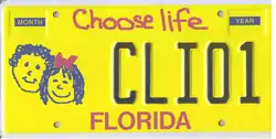 Choose Life license plates are specialty license plates available in 33[1][2] states in the United States that express an anti-abortion message. The plates are the concept of Choose Life, Inc., an anti-abortion advocacy group based in Ocala, Florida.[3] It was founded in 1997 by Randy Harris, a Marion County commissioner, after being inspired by an environmental license plate on the car in front of him to use specialty license plates as a way to raise funds for crisis pregnancy centers, which are nonprofit organizations established to counsel women against receiving abortions.[4] The plates feature the phrase "Choose Life", a slogan used by the anti-abortion movement, and a Microsoft Paint style drawing of two children.[4]