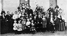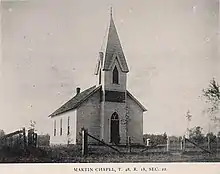 In 1870, St. Martin's Catholic Church, an 18x24 log structure, was built in Chouteau Springs on 1.5 acres of land donated by Daniel Martin, called "Martinsville."[7] A larger frame structure church was built on the same grounds in 1877 and in 1908 a solid red brick church was built on 2.25 acres donated by Anton Joseph Wesselman. The third church was about 1/4 mile north of the Chouteau Springs KATY railroad station. In 1920 St. Martin's Parochial School was built next to the brick church.[8] One hundred years after the first church was built in 1870, the Diocese closed down St. Martin's Church and School in 1970. St. Martin's Cemetery (Chouteau Springs "Martinsville") is located on the eastern rim of Chouteau Springs 38.9169006°N 92.8778000°W. Cemetery records are regularly surveyed.