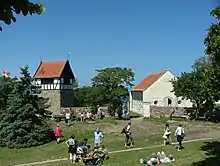 In the south-west corner of the churchyard there is a free-standing bell tower with two bells. Typical of the Bornholm style, it consists of a fieldstone base and a half-timbered belfry.[1]