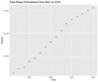 Lacrosse is one of the fastest growing sports in America, at the collegiate level. Across both men’s and women’s collegiate athletic programs, lacrosse experienced greater growth in the number of teams than any other sport.[8] The number of women’s lacrosse teams more than doubled between 2003 and 2023, rising from 256 to 541 teams.[9] Men’s lacrosse experienced nearly a 70% increase during the same 20-year period, increasing from 236 to 398 teams.[9] The growth across all three NCAA lacrosse Divisions has increased the scholarships available to students seeking to continue playing lacrosse at the collegiate level.[8] As of 2017, the total college player population of both men and women increased from 253,931 in 2001 to 826,033 in 2016. The linear growth can be seen in the graph right side.