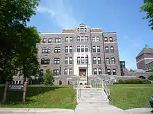 Tower Hall is St. Scholastica's castle-like central building. Its origins date to a picnic in around 1907, when the Diocese of Duluth's Bishop James McGolrick commented that the top of the hill at the college's current site was a perfect location for a building.[9] According to the historic records of Sister Agnes Somers, McGolrick and a group of students and sisters climbed to the top of the hill and placed a pile of stones, symbolizing the cornerstone of what would eventually become Tower Hall.[9] In 1906, architects Anton Werner Lignell and Frederick German were hired to draw the plans for the school, Villa Sancta Scholastica Academy, and the motherhouse. Mother Scholastica Kerst disapproved of the plans due to potential defects in the building's design, and the two architects were fired from the project in 1908; it was taken over by Franklin Ellerbe.[10][11][12] The following year saw the groundbreaking and start of construction for Tower Hall. Its first unit was completed in 1909. That September, 75 students from the Institute of the Sacred Heart were relocated to what was then called Villa St. Scholastica. Tower Hall was completed in 1928, and had two towers, a north to south axis of 375 feet, turrets at each end, recessed fenestration, and Tudor towers flanking the façade.