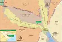 The park resides entirely within the Congaree River Floodplain Complex with flood deposits of sand, silt, and clay. Muck and peat are the products of vegetation decay. The meander of the river has produced distinctive oxbow lakes. North of the park is the NE-SW regional trending Augusta Fault and the Terrace Complex consisting of Pliocene fluvial terraces. South of the park is the Southern Bluffs, which have been eroding since the Late Pleistocene. West of the park is the Fall Line and Piedmont.[14]