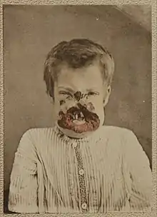 - Rhagades, linear scars at the angles of the mouth and nose result from bacterial infection of skin lesions