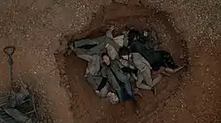 Outside the walls, Sasha buries a group of walkers she had killed. However, still emotionally unstable, she goes into the grave and lies among the pile of corpses. Elsewhere outside the wall Daryl and Aaron see a survivor wearing a red poncho (Jason Alexander Davis) in the forest, but lose track of him, and decide to scavenge supplies from a food truck. However, they set off a trap that unleashes a horde of walkers and are forced to take shelter inside a car.
