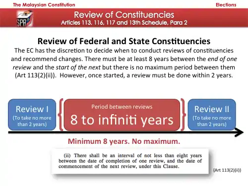 The EC is also required to review the division of Federal and State constituencies and recommend changes in order that the constituencies comply with the provisions of the 13th Schedule on the delimitation of constituencies (Art. 113(2)).