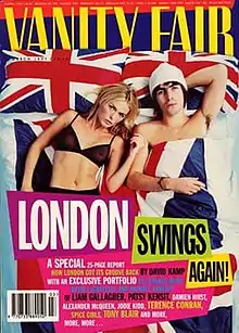In March 1997 Vanity Fair published a special edition on Cool Britannia with Liam Gallagher and Patsy Kensit on the cover; the title read 'London Swings! Again!'.[9] Figures in the issues included Alexander McQueen, Damien Hirst, Graham Coxon and the editorial staff of Loaded. Tony Blair’s speech at the 1996 Labour party conference drew on the optimism of the Euro 96 football championships – accompanied with the summer’s chart-topping anthem “Three Lions”. Alluding to the "thirty years of hurt" lyric in the song (since England last won the World Cup), Blair stated, "Seventeen years of hurt never stopped us dreaming. Labour’s coming home."[15] After the Labour party won its landslide, there was even more enthusiasm.[4]