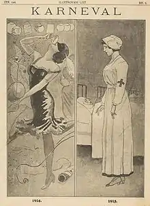 ![]() 1915 caricature from the Carnival magazine shows the sharp contrast of pre-war and wartime life in Zagreb | |