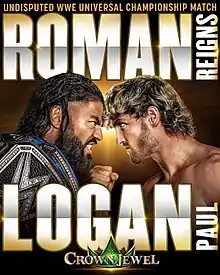 After Roman Reigns appeared on Logan Paul's podcast Impaulsive, the social media influencer then trash-talked Reigns after the latter left the set. This led to a social media exchange, resulting in Paul appearing on the September 16 episode of SmackDown where he confronted The Bloodline to invite Reigns to a press conference in Las Vegas the following day.[12] At the conference, WWE executive Triple H announced that Reigns would defend the Undisputed WWE Universal Championship against Paul in the main event of Crown Jewel, marking only Paul's third match in WWE.[13] During the Crown Jewel press conference the day before the event, it was confirmed that while Reigns would have The Bloodline in his corner (except Sami Zayn),[lower-alpha 1] Paul would be backed by his brother Jake Paul.[15]