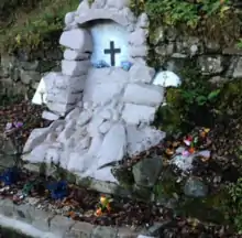 A notable feature of the village is the Croy Shrine located in the Nethercroy area to the north-east. The Shrine was built around a natural spring in the mid-1970s by local residents and featured a statue of The Virgin Mary in a grotto scene with a stone channel in front to allow access to the spring water.[17] The Shrine fell into a state of disrepair over the years due to neglect and vandalism. In 2013 some local residents rebuilt it and a rededication ceremony was held in 2014.