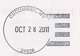 Cucumber is a census-designated place (CDP) in McDowell County, West Virginia, United States. Its population was 74 at the 2020 census.[4] The community is centered on mining. Named either for nearby Cucumber Creek[5] or for the cucumber trees in the area,[6] it is the only community in the United States with this name. Its post office was still active as of October 2011 (see image).