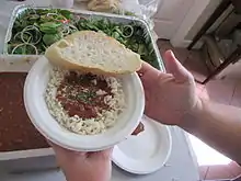 - Rice and gravy—small pieces of beef, or sometimes chicken or pork, simmered for a long time with onions, peppers, and other seasonings, and served over white rice[41]