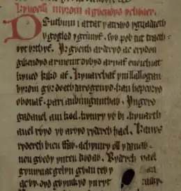 Cyfoesi Myrddin a Gwenddydd ei Chwaer ("The Conversation of Myrddin and His Sister Gwenddydd")[1] is an anonymous Middle Welsh poem of uncertain date consisting of 136 stanzas, mostly in englyn form.[2] Myrddin, the legendary 6th-century North British bard and warrior, is depicted as being encouraged by his sister Gwenddydd to utter a series of prophecies detailing the future history of the kings of Gwynedd, leading up to an apocalyptic ending. The mood of the poem has been described as "one of despair and of loss of faith and trust in this world".[3]