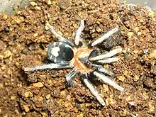 Cyriocosmus elegans is a fossorial species of tarantula that is known to reach maturity quickly, sometimes in a year's time. Adult size is around 1.5" to 2" diagonal leg span (DLS), from leg I on one side to leg IV on the opposite side. Second instar spiderlings are around 1/16" to 1/8" DLS and will readily accept pre-killed feeders, fruit flies, or even a cricket leg.