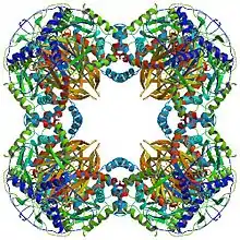 The cubic core structure, found in species such as Azotobacter vinelandii, is made up of 24 subunits total.[8][9] The catalytic domains are assembled into trimers with the active site located at the subunit interface. The topology of this trimer active site is identical to that of chloramphenicol acetyltransferase. Eight of these trimers are then arranged into a hollow truncated cube. The two main substrates, CoA and the lipoamide (Lip(SH)2), are found at two opposite entrances of a 30 Å long channel which runs between the subunits and forms the catalytic center. CoA enters from the inside of the cube, and the lipoamide enters from the outside.[10]