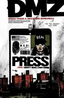 ![]() Cover art by Brian Wood for DMZ issue #3 – the third part of the "On the Ground" arc – featuring the press pass of protagonist Matty Roth above the Manhattan skyline | |