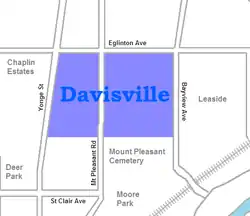 Davisville Village is a neighbourhood of Toronto, Ontario, Canada. It is located near the intersection of Davisville Avenue and Yonge Street. There is a subway station named Davisville at this intersection. The area directly abuts Mount Pleasant Cemetery, and has many massive apartment and condominium complexes built between the 1970s and the 2000s, as well as a number of office buildings. The area is within Midtown Toronto between St Clair and Eglinton. Davisville Village is represented at Toronto City Council by Councillor Josh Matlow.