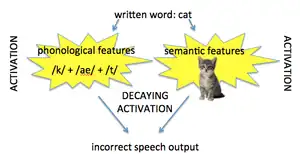 The "connectionist model" suggests that the phonological and semantic features of a word are activated, but this activation decays at a rate too quick for cognitive processing- thus, errors in speech output are produced as a result of this fading activation.[2][3] This hypothesis explains the broad symptom-complex of deep dyslexics without resorting to a multiple loci damage approach as seen in other models.[2][3] It eliminates the need to attribute a specific locus of damage to each symptom of deep dylsexia, and instead states that all symptoms are due to decay of a large activation area.[2][3]