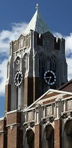 Perhaps the most iconic feature of the Denfeld High School building is its 120-foot clock tower. The tower features eight buttresses. Its face was designed by Carl Shroer, a teacher at Central High School, and was completed by Denfeld students who welded together four sections cast in aluminum by the Duluth Brassworks Company. The numbers on the face were painted silver and the clock hands were gold painted wood. The face was later painted black, in order to make it more easily visible from Grand Avenue.