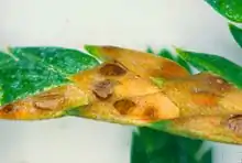 | Didymascella thujina on western red cedar leaflets. Yellow leaflets are infected by the fungus, whereas green leaflets are uninfected. Apothecia are reddish brown to dark brown in colour. The mature apothecia have a loosened host epidermal layer and the immature apothecia have not yet broken through the host epidermal layer. | |