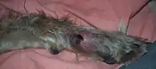 Grapes and raisins can cause acute kidney failure in dogs[40] The exact mechanism is unknown, nor is there any means to determine the susceptibility of an individual dog. While as little as one raisin can be toxic to a susceptible 10 pounds (4.5 kg) dog, some other dogs have eaten as much as a pound of grapes or raisins at a time without ill effects. The affected dog usually vomits a few hours after consumption and begins showing signs of kidney failure three to five days later. A mycotoxin is suspected to be involved, but one has not been found in grapes or raisins ingested by affected dogs. Salicylate, tartaric acid, or potassium bitartrate have also been implicated. The reason some dogs develop kidney failure following ingestion of grapes and raisins is not known.[41][42][43][44] The most common pathological finding is proximal renal tubular necrosis.[45]
