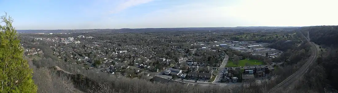 Dundas /ˈdʌnˌdæs/ is a community and town in Hamilton, Ontario, Canada. It is nicknamed the Valley Town because of its topographical location at the bottom of the Niagara Escarpment on the western edge of Lake Ontario. The population has been stable for decades at about twenty thousand, largely because it has not annexed rural land from the protected Dundas Valley Conservation Area.