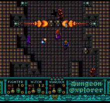 Dungeon Explorer is an action role-playing game with dungeon crawl and hack and slash elements that is played in a top-down perspective reminiscent of Gauntlet where players assume the role of one of the eight main characters tasked with recovering the Ora stone to ultimately kill the alien king Natas and restore peace to the land of Oddesia.[1][2][3] Each character belongs to a class (fighter, thief, warlock, witch, bishop, elf, bard, or gnome) and their abilities vary primarily in their black and white magic as well as statistics.[1] For example, the bishop's white potion heals nearby allies, whereas the bard's black potion has the ability to change the music. Special classes, like the princess and hermit, can also be unlocked via password as the game progresses.[2][3]