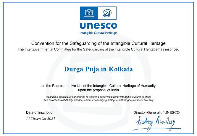 Durga Puja in Kolkata has been inscribed on the list of 'Intangible Cultural Heritage of Humanity' by The United Nations Educational, Scientific and Cultural Organization - UNESCO in December 2021.[6]