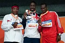 He won his fifth national title in the 60 m in 2012 with a season's best of 6.58 m.[199] A third consecutive podium finish came at the 2012 IAAF World Indoor Championships, where he pipped Trell Kimmons to the bronze medal.[200] Chambers was given the chance to return to the Olympic stage after the Court of Arbitration for Sport (CAS) decided in favour of the World Anti-Doping Agency over the validity of British Olympic Association's (BOA) Olympic ban by-law. CAS agreed that the law was non-compliant with the World Anti-Doping Code, to which the BOA was signatory due to its connection with the International Olympic Committee.[201] Chambers ran a 150 m-straight best of 15.27 seconds at the Great City Games in May then won the 100 m Olympic trial race, holding off emerging teenager Adam Gemili.[202][203] His absence from the major track circuit came to an end with a run at the Diamond League London Grand Prix, although he did not achieve the Olympic "A" standard time there.[204]
