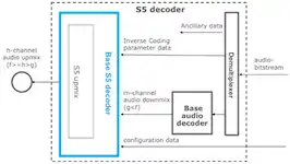 Compressing the downmix audio by a base audio coder further increases the coding efficiency of S5. The various bitstreams produced by the functional units of an S5 encoder may be encapsulated into a single bitstream by the functional unit 'Multiplexer'.
