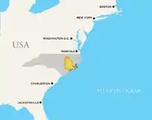There are deep-water bulk, break-bulk cargo and container facilities in ENC at Morehead City, NC and Wilmington, NC. A third comprehensive deep-water (Panamx-ready) port exists just north of the state line in Norfolk/Portsmouth, VA. All three ports also have RoRo (roll-on, roll-off) facilities to handle autos and military equipment.