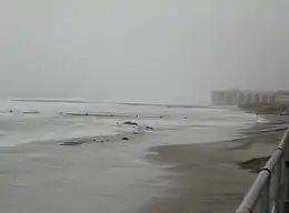 Hurricane Isabel produced slightly above normal tides and rough surf along the Jersey shore, killing one surfer off of Wildwood Crest.[15] The combination of gusty winds and the heavy surf produced moderate beach erosion along much of the coastline, primarily to beaches facing southeastward. In the Delaware Bay and River area, no significant erosion was reported, though coastal flooding from the hurricane washed out a road and destroyed the deck of a house in Baypoint. In Cape May County waves eroded the beaches by up to 4 feet (1.2 m) in Ocean City and Avalon, with several cities experiencing a loss of dunes and geotubes in Whale Beach being exposed. Waves from Isabel in Atlantic County resulted in light damage, minor coastal flooding, and slight beach erosion. The beaches of southern Ocean County experienced a loss of 3 to 4 feet (0.91 to 1.22 m) of sand, while locations further to the north experienced only minor erosion. Most coastal areas of Monmouth County reported eroded beaches by up to 4 feet (1.2 m), with Union Beach losing about 5,000 sq. feet (465 sq. m) of sand.[16]