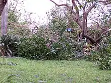 A man in the unincorporated community of Loxahatchee died after he was crushed by a tree that pushed him into the windshield of his vehicle.[100] The metal roof at Western Pines Middle School was peeled back, exposing multiple classrooms.[101] In nearby Royal Palm Beach, 331 homes were impacted.[92] Damage there reached about $9 million, including about $1.5 million to village property.[102] The village of Wellington suffered severe damage. The community center nearly lost its roof, the bleachers around the pool collapsed, and fences and canopies surrounding the tennis courts were destroyed. A few local parks experienced similar effects to their bleachers and sports facilities.[103] Palm Beach Central High School was severely damaged. Its kitchen and cafeteria lost portions of their roof, the theater and media center were flooded, the gym suffered a roof leak, and trees, signs, and fences were knocked down throughout campus.[104] Many trees and utility poles were snapped at The Mall at Wellington Green.[91] Approximately 3,955 homes were impacted and 4 others destroyed.[92] Overall, Wellington suffered almost $62 million in damage, with $50.4 million to property, and $3.8 million to public facilities, with repairs costs reaching almost $5.9 million.[105]