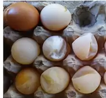 The first sign of EDS '76 is usually the loss of colour pigment in the eggs, followed by the production of thin-shelled, soft-shelled and even shell-less eggs. The thin-shelled and shell-less eggs are so fragile and thus may get eaten by the chickens and get disregarded as litters. The shells may also be rough or chalky. Watery egg whites and a reduction in egg size may also happen as well.[12][13]