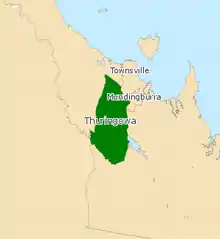 The division encompasses suburbs of the former City of Thuringowa on the western edge of Townsville in North Queensland, stretching from Deeragun in the north to Kelso in the south. It includes the suburbs of Bushland Beach, Shaw, Thuringowa Central, Rasmussen, Condon and Kirwan.[1][2]