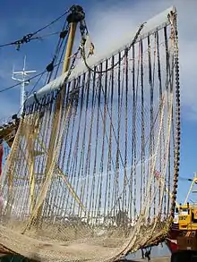 Electric pulse fishing is a fishing technique sometimes used in trawl fisheries which produces a limited electric field above the seabed to catch fish.[1] The pulse trawl gear consists of a number of electrodes, attached to the gear in the tow direction, that emit short electric pulses. The electrodes replace the tickler chains that are used in traditional beam trawl fishery. The pulse trawl fishery is mainly aimed at flatfish like sole, with by-catch plaice. In addition, the pulse trawl gear is applied in shrimp fisheries on a limited scale. Technically, the use of electricity to catch fish is prohibited in European waters. However, the European Union is able to provide exemptions to this rule since 2007. These exemptions are now mainly used by Dutch and British[2] trawlers in the North Sea.