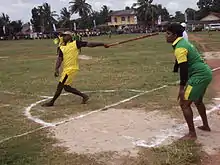 Elle is a popular bat-and-ball game in Sri Lanka which is also a localised name for slow-pitch softball, often played in rural villages and urban areas. From modern-day sports popular around the world, Elle has the most similarities with softball. The game is played between two teams and the play scenario involves a hitter, a pitcher and fielders. The hitter is given three chances to hit the ball pitched at him or her. Once the hitter hits the ball with the bat – often a sturdy bamboo stick – the hitter has to complete a round or run which includes four possible "stoppings" spaced 55 metres (180 ft) apart. A strikeout happens if the hitter's ball is caught by the fielding side or if the fielding side is able to hit the hitter with the ball while he or she is in the course of completing a run. The hitter can stop only at one of the three stoppings in the round thereby paving the way for another member of his team to come and become the hitter. The side that gets the highest number of (complete) runs wins the match.